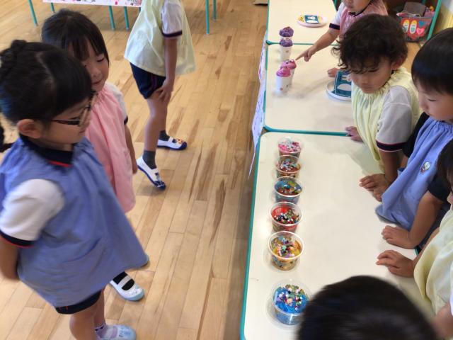 お店屋さんを作ってアイスを売る店員さん、そしてアイスを買うお客さんになって楽しそうに遊んでいました!お店もつきぐみのお友達みんなで協力して作り、立派なお店屋さんが完成していましたよ⭐︎